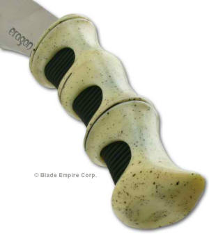 with a stainless steel blade and simulated leather wrapped bone handle.