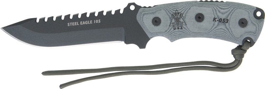 . Tops Steel Eagle. 9 7/8" overall. 5 1/8" blade with sawback. Black Kydex belt clip sheath. Black traction coated 1095 carbon steel blade. Full tang. Black linen micarta handles. Lanyard hole.