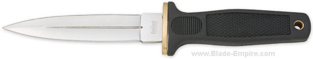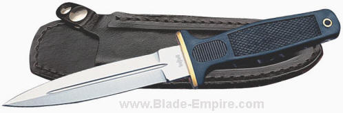 Black rubber handle, checkered grip, brass guard, with 420 stainless steel blade. Includes leather boot clip sheath. 4-3/4" blade, 9" overall.