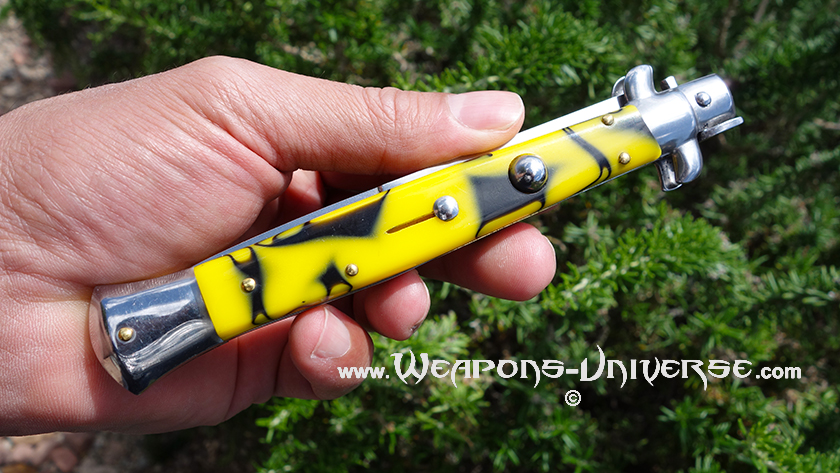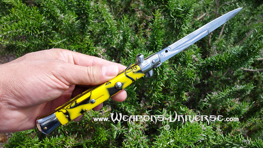 Italian stiletto switchblade, yellow with black swirls, 11 inch, automatic knife -
