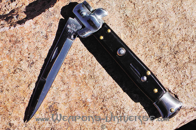 the automatic blade pops out from the side. Pull a trigger to release the blade