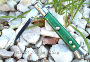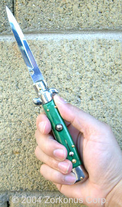 the automatic blade pops out from the side. Pull a trigger to release the blade