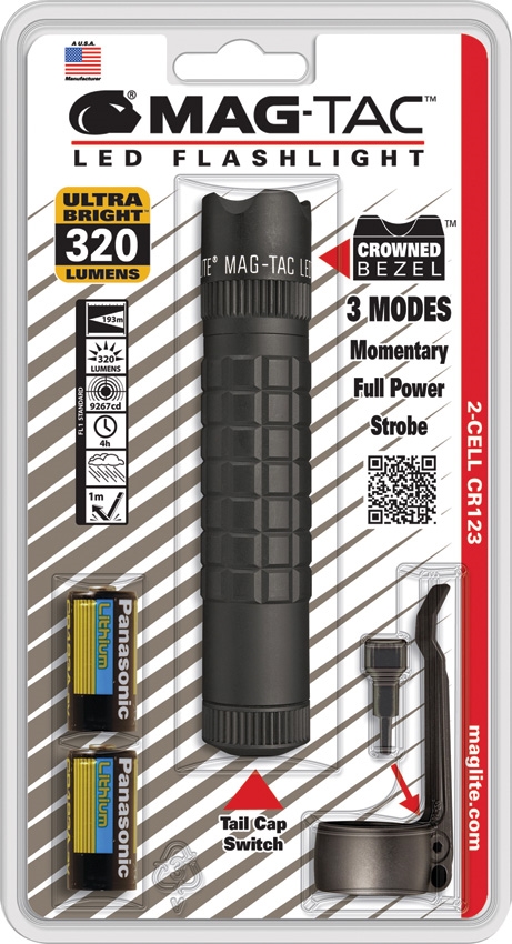 Mag-lite ml67043 mag-tac led, black. 5 1/8" overall. Grooved aircraft grade aluminum body with anodized finish, crowned bezel, and tail cap push-button switch. Water resistant up to 1m. Three modes: momentary, on, and strobe. Ultra Bright white LED with up to 320 lumen output. Visible up to 193m. Requires two CR123 batteries (included). Up to 4 hour run time on high and up to 17 hour run time on low. Hang packaged. Lithium Metal with package. Can not ship Post Office. Can not ship to Australia.