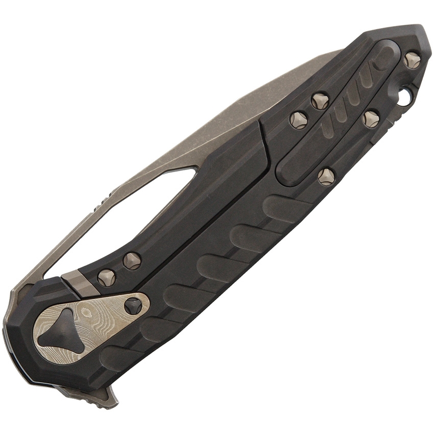 Marfione mfc396 custom sigil dlc knife, titanium. Closed: 4.5"; Blade: 3.5" l Elmax Steel l Standard Edge; Other Info: Thumb Slot l Extended Tang l Lanyard Hole. Bronzed apocalyptic coated blade. DLC coated handles with bronzed hardware and bronzed Damascus plate. Serialized. Certificate of Authenticity. Comes in black nylon zippered storage pouch with microfiber polishing cloth. Boxed.