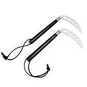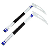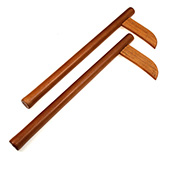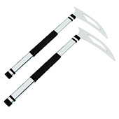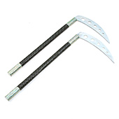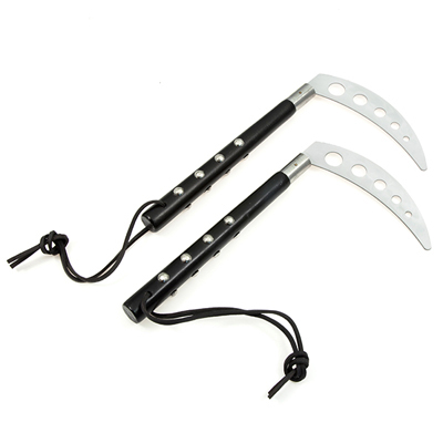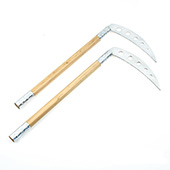 This martial arts weapon resembles a smaller scythe, with a half-moon shaped blade that is blunt on the outside but razor sharp on the inside. The blade should be the heaviest part of the weapon. The kama’s shaft tapers toward the butt end, increasing in thickness. This weapon is used as a matched pair, one in each hand.