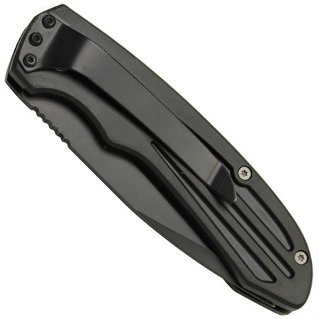 push button deployment. It offers a drop point blade with black anodize